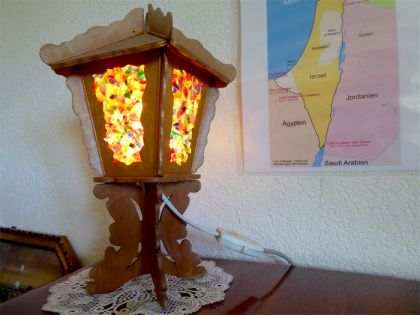 Wir Bausoldaten hatten auch einen größeren Schuppen, wo wir unbrauchbares von Renovierungen und u.a. Möbel einlagerten bzw. Gutes heraussuchten. Ich entdeckte dünne Sperrholzplatten und versteckte etliches in meinem Spint. Da wir auch sehr viel Urlaub hatten, brachte ich eine Laubsäge mit und bastelte im Objekt eine Lampe (Foto).